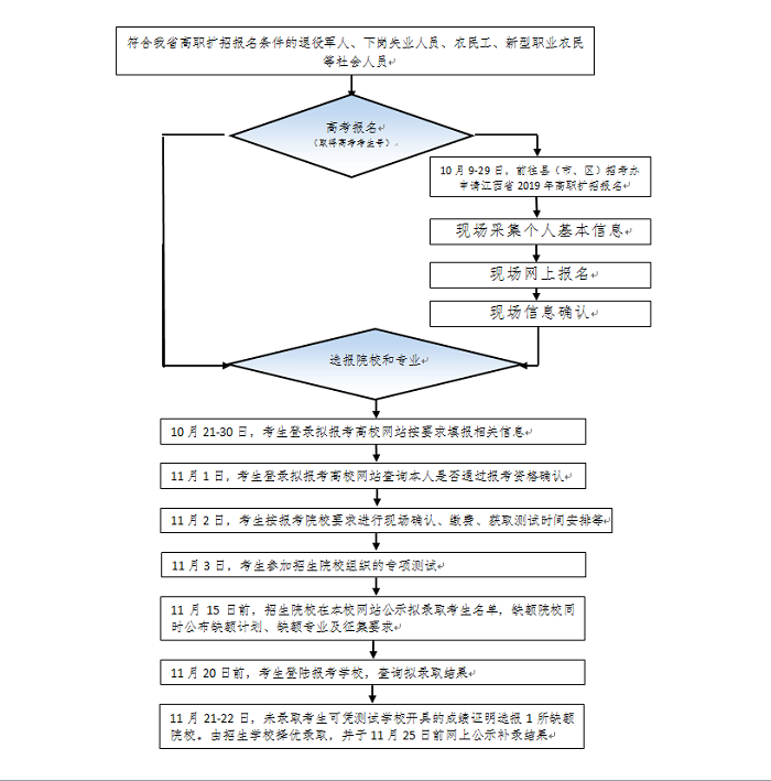 江西省2019年高職擴招社會人員專項招生報名、測試和錄取工作流程圖