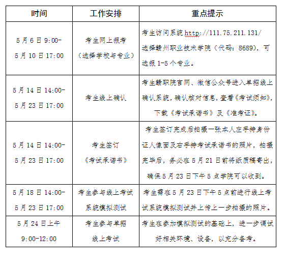 郵寄地址:江西省贛州市南康區新能源汽車科技城贛州職業技術學院招就處,聯系電話:19907076703(備注:單招承諾書),盡量使用EMS及順豐寄送,務必在5月21日前寄送,5月23日下午5點還未收到考生的紙質承諾書的,我院將取消該考生的考試資格。