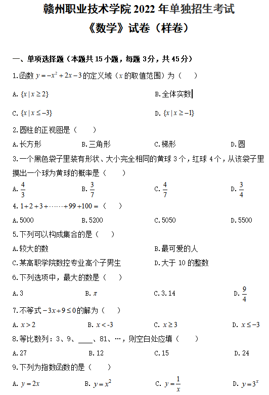 贛州職業技術學院2022年單獨招生考試