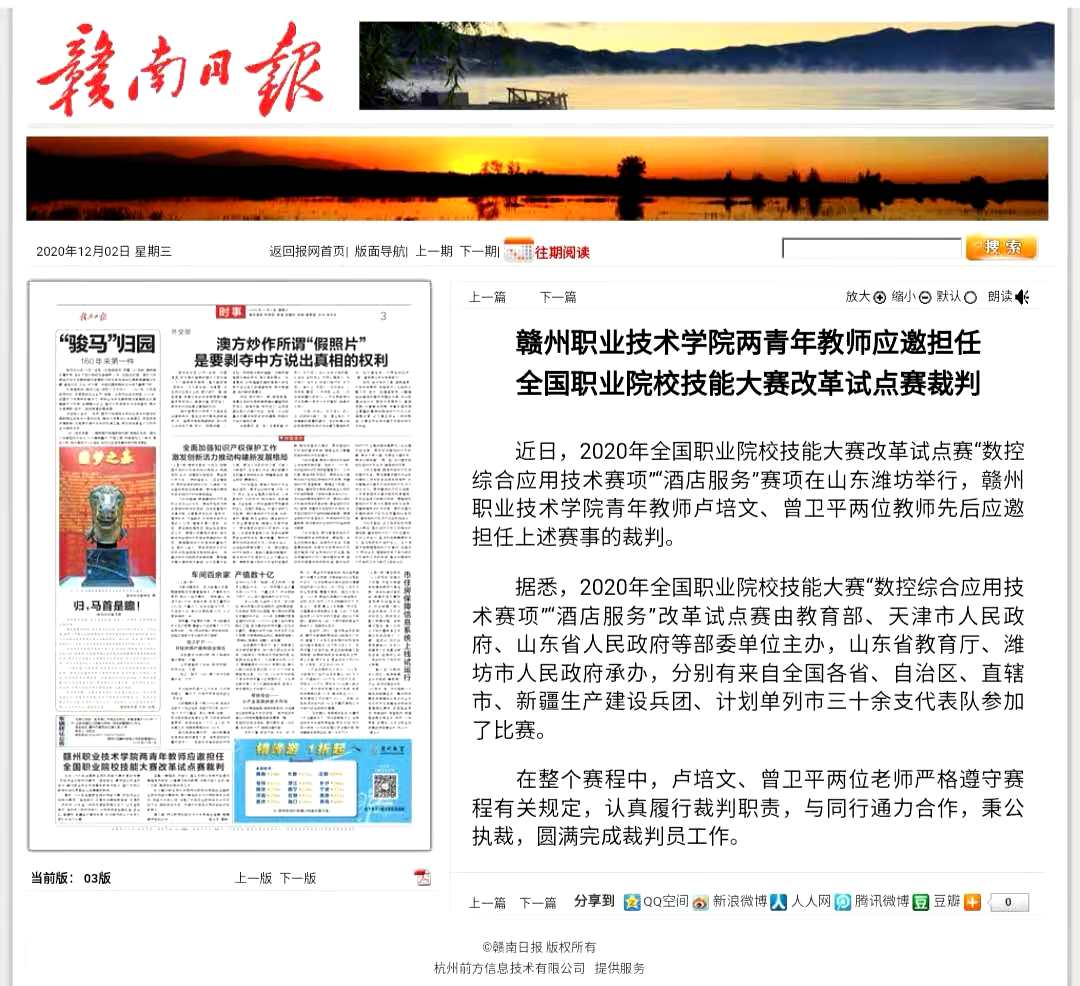 近日,2020年全國職業院校技能大賽改革試點賽“數控綜合應用技術賽項”“酒店服務”賽項在山東濰坊舉行,贛州職業技術學院青年教師盧培文、曾衛平兩位教師先后應邀擔任上述賽事的裁判。