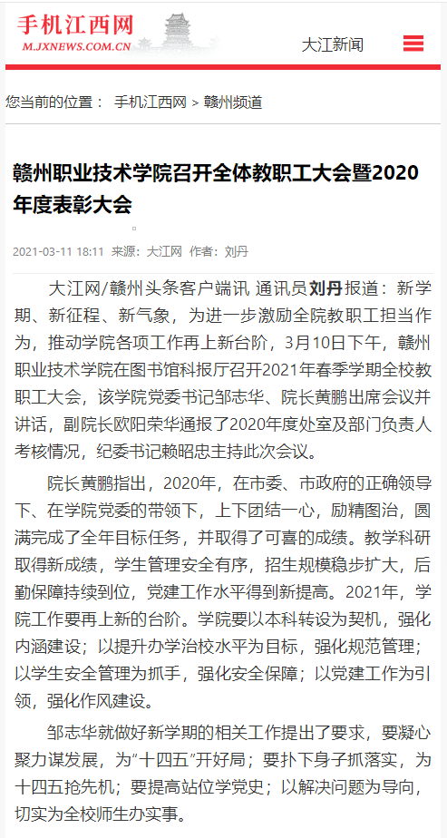 大江網/贛州頭條客戶端訊 通訊員劉丹報道:新學期、新征程、新氣象,為進一步激勵全院教職工擔當作為,推動學院各項工作再上新臺階,3月10日下午,贛州職業技術學院在圖書館科報廳召開2021年春季學期全校教職工大會,該學院黨委書記鄒志華、院長黃鵬出席會議并講話,副院長歐陽榮華通報了2020年度處室及部門負責人考核情況,紀委書記賴昭忠主持此次會議。