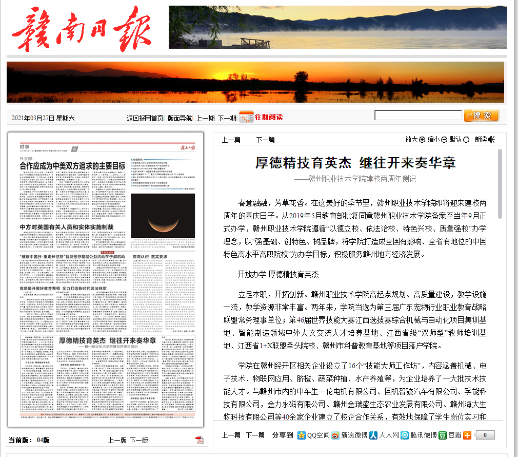 當(dāng)前,全球新一輪科技革命和產(chǎn)業(yè)變革蓄勢待發(fā),以中國為代表的新興科技強(qiáng)國正在努力向科技產(chǎn)業(yè)變革的第一方陣進(jìn)發(fā),職業(yè)教育承擔(dān)著為科技革命和產(chǎn)業(yè)變革培養(yǎng)大量高素質(zhì)技術(shù)技能人才的重任。未來,贛州職業(yè)技術(shù)學(xué)院將以重于泰山的使命感,只爭朝夕的緊迫感,逆水行舟的危機(jī)感,緊緊抓住發(fā)展機(jī)遇,堅持正確的辦學(xué)方向,堅持立德樹人,全面提高人才培養(yǎng)能力,秉承優(yōu)良傳統(tǒng),借鑒先進(jìn)經(jīng)驗,發(fā)掘自身優(yōu)勢,迎接新挑戰(zhàn)、開拓新境界、實現(xiàn)新突破、重攀新高峰、再創(chuàng)新輝煌,譜寫學(xué)院事業(yè)發(fā)展的新篇章。(曾衛(wèi)平 劉丹 譚輝)