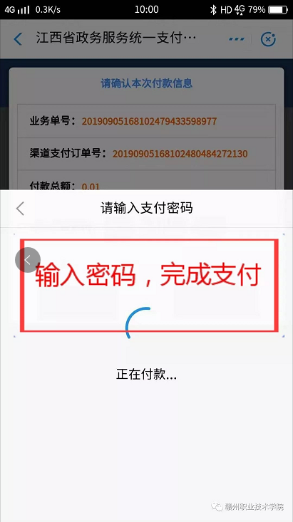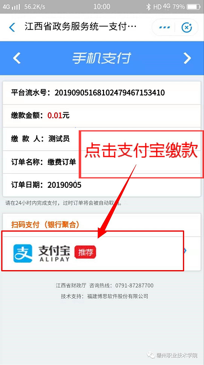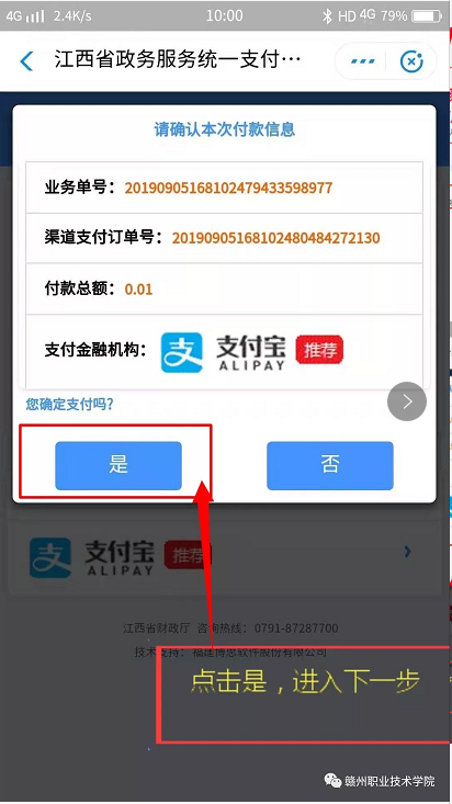 ①打開手機(jī)支付寶→②點(diǎn)擊城市服務(wù)(定位贛州)→③贛服通→④(向下滑動(dòng))選擇“主題服務(wù)”(全省通辦)→⑤進(jìn)入“支付繳費(fèi)”→⑥選擇“繳款碼付款”輸入20位繳款碼、驗(yàn)證碼→⑦請(qǐng)務(wù)必仔細(xì)認(rèn)真核對(duì),確認(rèn)信息無誤→⑧點(diǎn)擊“確認(rèn)去付款”→⑨點(diǎn)擊支付寶繳款,進(jìn)入支付頁面→⑩輸入密碼,完成支付→?跳轉(zhuǎn)繳款成功提示界面→?手機(jī)收到票據(jù)信息短信,含代碼、號(hào)碼、校驗(yàn).