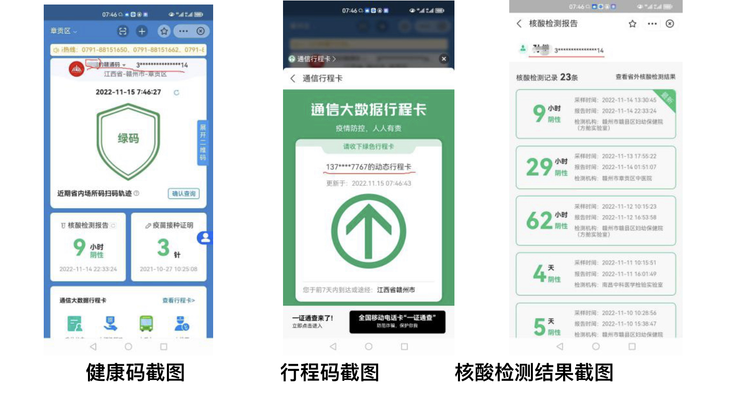上傳三項截圖要求:1.必須為上傳當(dāng)天的截圖。2.三項截圖中必須有對應(yīng)人員的相關(guān)信息(如下面三圖中劃紅線部分所示)。3.核酸檢測結(jié)果的截圖必須和示例圖片一致。