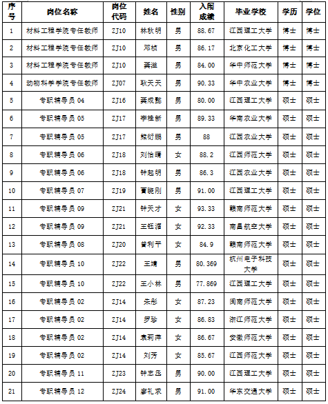根據《贛州職業技術學院2025年高層次人才招聘公告》要求,本次招聘報名、資格審查、面試考核、體檢、政審考察等程序已完成,現將擬聘用人員名單公示如下: