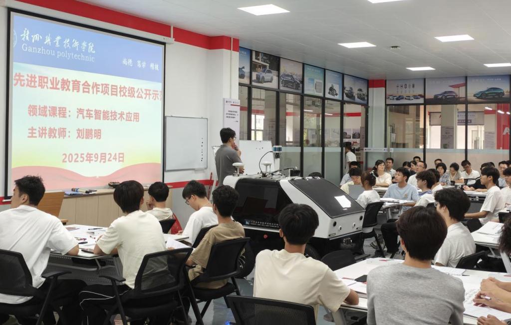 汽車工程學院中德SGAVE項目教學團隊教師劉鵬明以領域課程汽車智能技術應用——學習情境2智駕系統為例,根據人才培養方案和課程教學目標,結合學校實際教學環境,按照“導學、信息、規劃、決策、執行、檢查、評價、系統化”八步教學法完成以用戶委托書為載體的知識技能課堂教學。課堂上,中德SGAVE班學生踴躍講解小組團隊精心設計的課程信息海報,分享項目教學法所獲得的知識技能提升、語言表達能力和團隊合作精神。