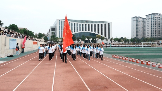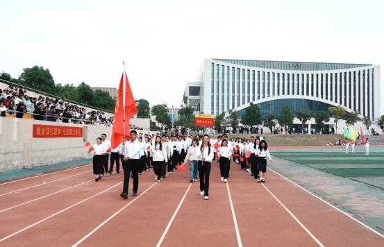 率先入場的國旗護(hù)衛(wèi)隊(duì)與校旗護(hù)衛(wèi)隊(duì),身著整齊制服,身姿挺拔如松,眼神堅(jiān)定如炬。鮮艷的五星紅旗在前方引領(lǐng),校旗緊隨其后迎風(fēng)飄揚(yáng),“尚德 篤學(xué) 精技 敬業(yè)”的校訓(xùn)精神在隊(duì)伍的步伐中愈發(fā)鮮明,為整場開幕式奠定了莊嚴(yán)而神圣的基調(diào)。