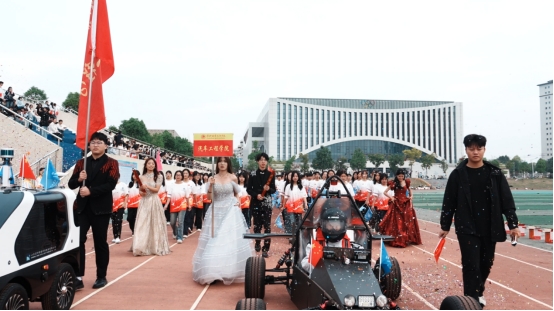 各二級(jí)學(xué)院方陣更是亮點(diǎn)紛呈,盡顯專業(yè)特色與學(xué)子風(fēng)采。材料工程學(xué)院方陣帶著“稀土”“儲(chǔ)能”“新能源”的科技使命而來,隊(duì)伍中象征守護(hù)的“消防服”,彰顯著用科技為逆行者鑄造“生命鎧甲”的責(zé)任擔(dān)當(dāng);動(dòng)物科學(xué)學(xué)院方陣以“牧歌飛揚(yáng),畜勢(shì)勃發(fā)”為豪情,將課堂上的遺傳育種、飼料研發(fā)熱情,化作賽場上如駿馬般的沖勁與黃牛般的堅(jiān)韌;電氣工程學(xué)院方陣邁著踏響創(chuàng)新節(jié)拍的步伐,立志以“電流為筆”書寫青春方程式;汽車工程學(xué)院方陣步伐鏗鏘如精密齒輪嚙合,手持國旗與校旗的學(xué)子眼中,閃爍著如內(nèi)燃機(jī)火花般的激情,要在賽場演繹“精工筑夢(mèng),馳騁如風(fēng)”的誓言。