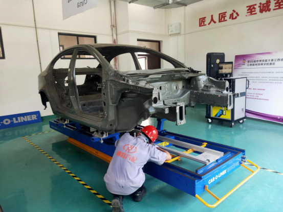 檢查組一行在學院領導謝尉明的陪同下,參觀了學院江西省選拔賽基地的“車身修理”項目賽場,車身修理項目教練、國家級裁判李斌帶領8名選手在學院實訓室展開集訓。