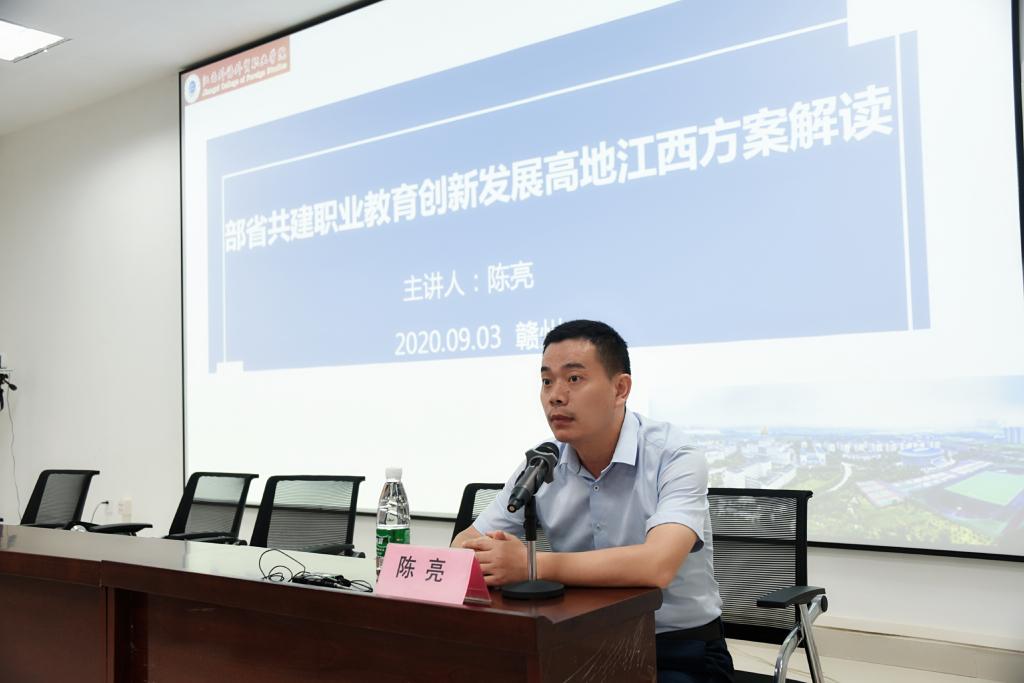 下午2:30,江西外語外貿(mào)職業(yè)學(xué)院教務(wù)處副處長陳亮教授對《江西省人民政府關(guān)于整省推進(jìn)職業(yè)教育綜合改革提質(zhì)創(chuàng)優(yōu)的意見》進(jìn)行了具體的文件解讀與經(jīng)驗(yàn)分享。陳教授對文件的背景與思路、目標(biāo)與舉措、亮點(diǎn)與特色以及機(jī)遇與使命進(jìn)行了重點(diǎn)的分析與解讀,并充分強(qiáng)調(diào)了政府對職業(yè)教育發(fā)展的高度重視。