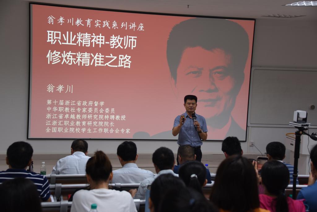上午8:30,翁孝川老師給我們授課《職業(yè)精神——教師修煉精準(zhǔn)之路》。在課堂上,他首先強(qiáng)調(diào)了“兩個(gè)一百年”奮斗目標(biāo),為全體教師播放了一個(gè)非常精彩的視頻《一個(gè)變化的世界》,并下到全體教師座位中間,用鏗鏘頓挫的話語解讀了這段視頻。通過這段視頻,每位老師深感自己的教學(xué)責(zé)任重大,必須跟得上時(shí)代變化的教學(xué)。他強(qiáng)調(diào),要想成為一名合格的教師,必須遵守“愛國守法、愛崗敬業(yè)、關(guān)愛學(xué)生、教書育人、為人師表、終身學(xué)習(xí)”的職業(yè)道德,要有“敬業(yè)、忠誠、負(fù)責(zé)、精業(yè)、協(xié)作、主動(dòng)、忠誠”的職業(yè)精神,職業(yè)精神重在堅(jiān)持不懈,我們高職教師必須要堅(jiān)持認(rèn)識(shí)自我,調(diào)節(jié)好情緒狀態(tài),提振精氣神,為了更好地培養(yǎng)全方位發(fā)展的學(xué)生而不懈奮斗!