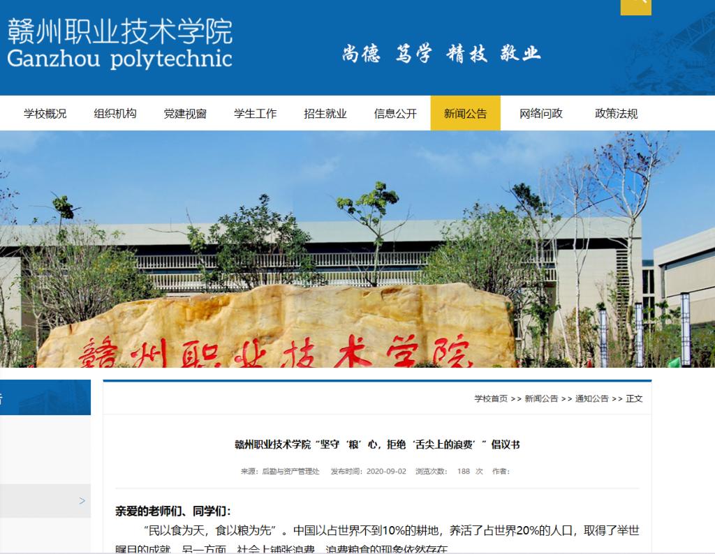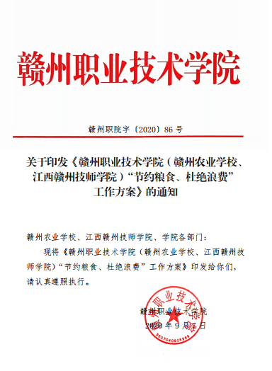 9月7日,學(xué)院印發(fā)《贛州職業(yè)技術(shù)學(xué)院(贛州農(nóng)業(yè)學(xué)校、江西贛州技師學(xué)院)“節(jié)約糧食、杜絕浪費(fèi)” 工作方案》,一方面發(fā)揮學(xué)校食堂主陣地作用,督促食堂實(shí)施標(biāo)準(zhǔn)化管理和精細(xì)化操作,為節(jié)約糧食做好基礎(chǔ)性和保障性工作。另一方面教育學(xué)生認(rèn)識(shí)食物,惜糧節(jié)約,敬畏自然,并通過勞技課培養(yǎng)學(xué)生勞動(dòng)實(shí)踐能力和吃苦耐勞精神。