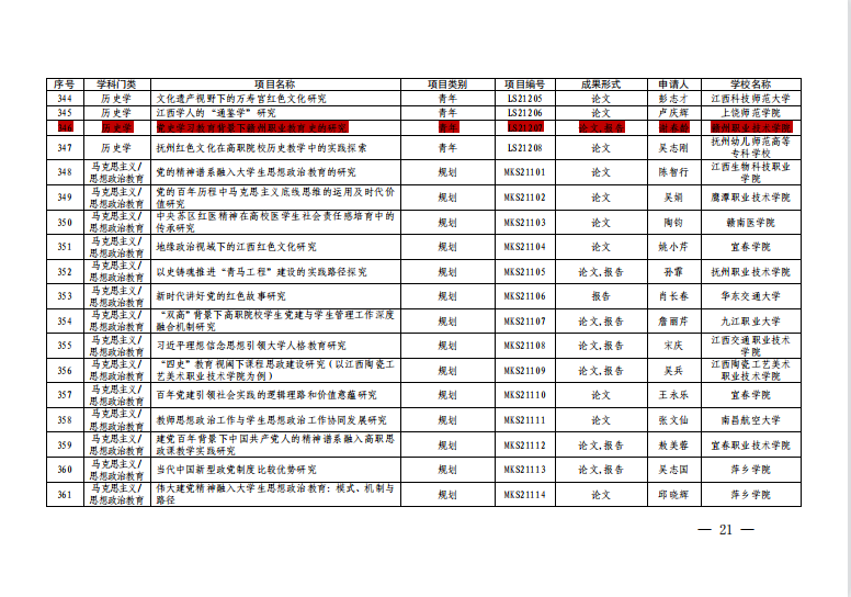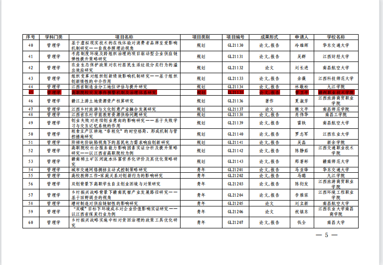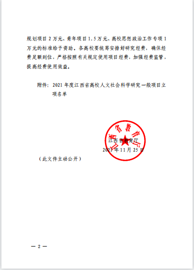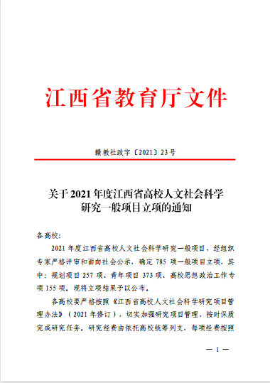 近日,從省教育廳下發的《關于2021年度江西省高校人文社會科學研究一般項目立項的通知》(贛教社政字〔2021〕23號)獲悉,我院共有2項2021年度江西省高校人文社會科學研究一般項目獲準立項,具體名單如下: