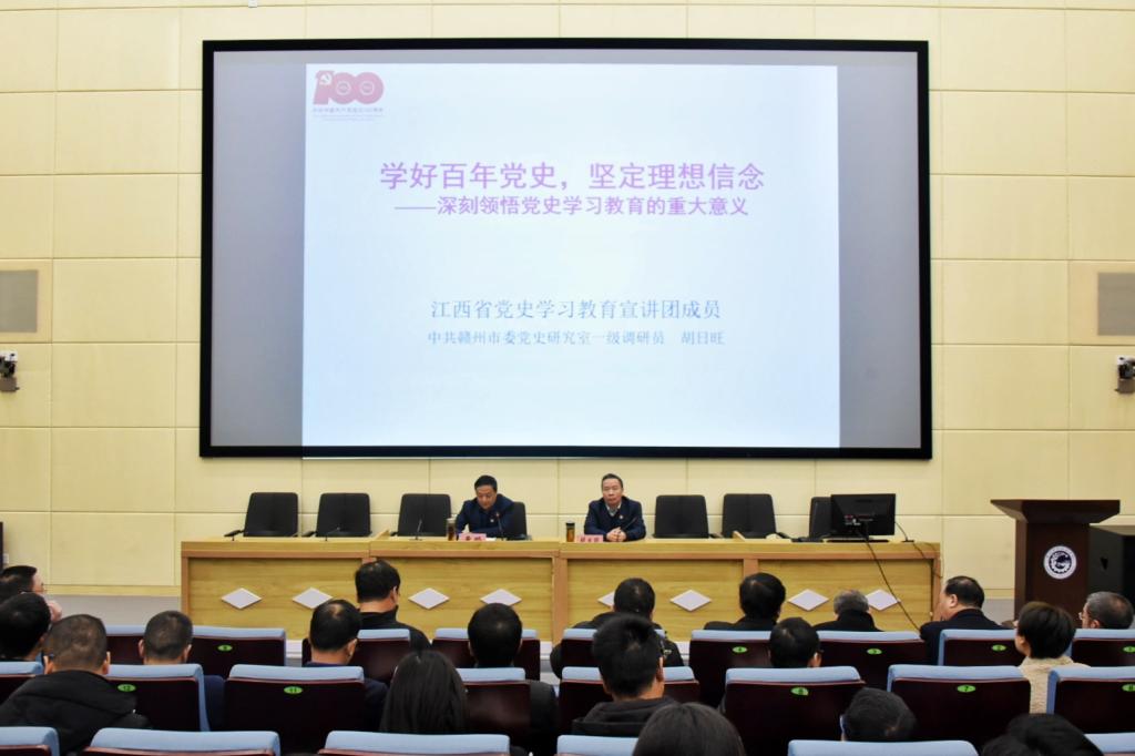 為深刻領(lǐng)悟黨史學(xué)習(xí)教育的重大意義,學(xué)好百年黨史,堅定理想信念,12月3日上午,學(xué)院邀請到江西省黨史學(xué)習(xí)教育宣講團成員、中共贛州市委黨史研究室一級調(diào)研員胡日旺來校作“學(xué)好百年黨史,堅定理想信念”的宣講報告。院長黃鵬主持會議并講話,三校在家領(lǐng)導(dǎo)班子、黨員干部、學(xué)生代表聆聽了宣講報告。