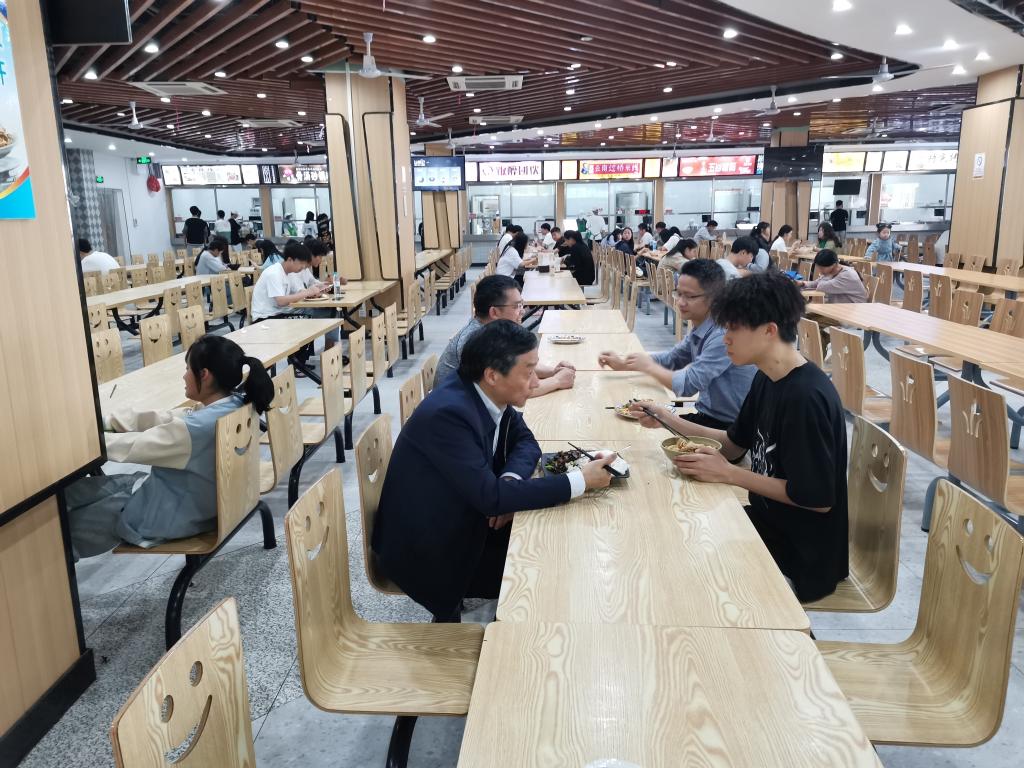 在學院二食堂三樓餐廳,黃鵬主動向正在就餐的同學們問好并作自我介紹,親切地詢問同學們的學習生活情況,詢問他們對學院工作的意見和建議。