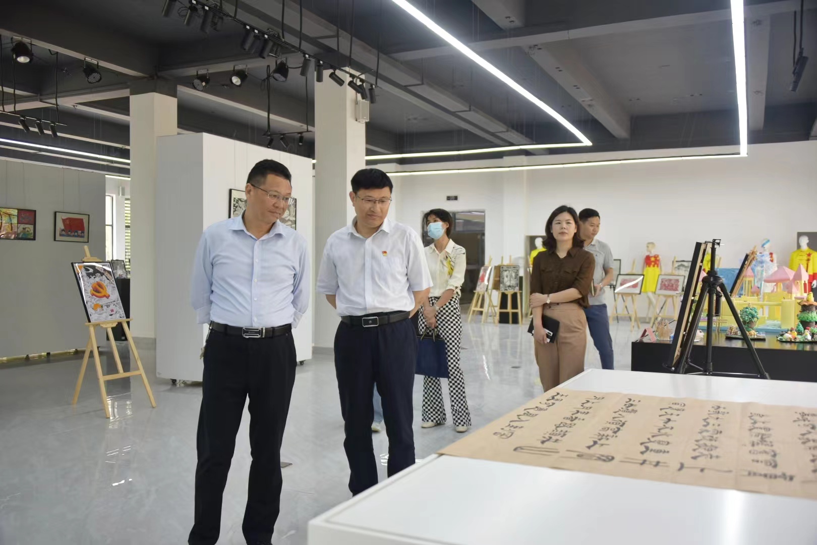 羅招榮一行參觀了學院藝術設計系數字展廳,充分肯定學院藝術設計系通過“黨建+教學+第二課堂”模式將紅色教育與專業特色緊密結合所開展的主題作品展覽活動,促使學生以更加飽滿的熱情、高昂的斗志、務實的作風投入到學習和生活當中,爭做新時代有為青年。