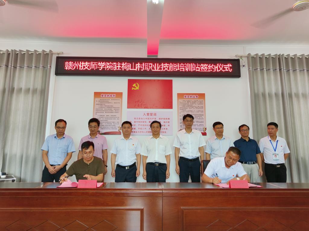 6月30日,贛州技師學院駐梅山村職業技能培訓站簽約揭牌儀式在大余縣南安鎮梅山村隆重舉行。贛州職業技術學院院長、贛州技師學院黨委書記黃鵬,大余縣縣委副書記周光仁,贛州技師學院副院長潘元生出席簽約揭牌儀式,儀式由南安鎮黨委書記廖俊生主持。