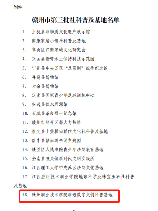 日前,贛州市社科規劃領導小組辦公室組織開展了第三批市級社科普及基地創評活動,我院由科研處牽頭,藝術設計系申報的“非遺數字文創科普基地”獲批。
