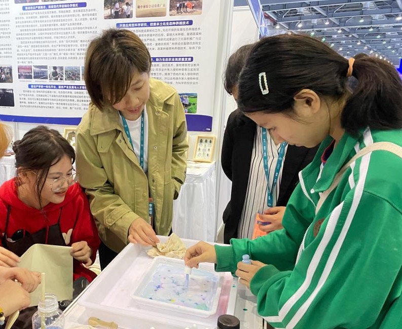 學(xué)院科研處組織藝術(shù)設(shè)計(jì)系、現(xiàn)代農(nóng)林工程系以及動物科學(xué)系師生在會展中展示了許多特色成果。藝術(shù)設(shè)計(jì)系的活版印刷設(shè)備以及水拓畫工藝吸引了眾多院校師生前來體驗(yàn)。