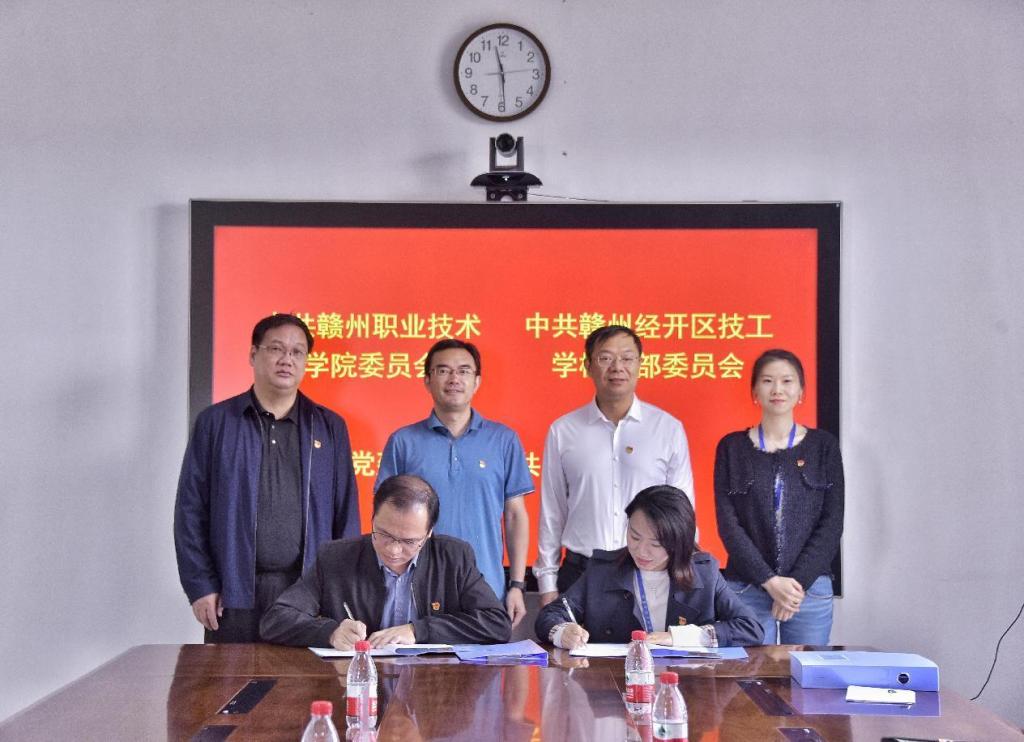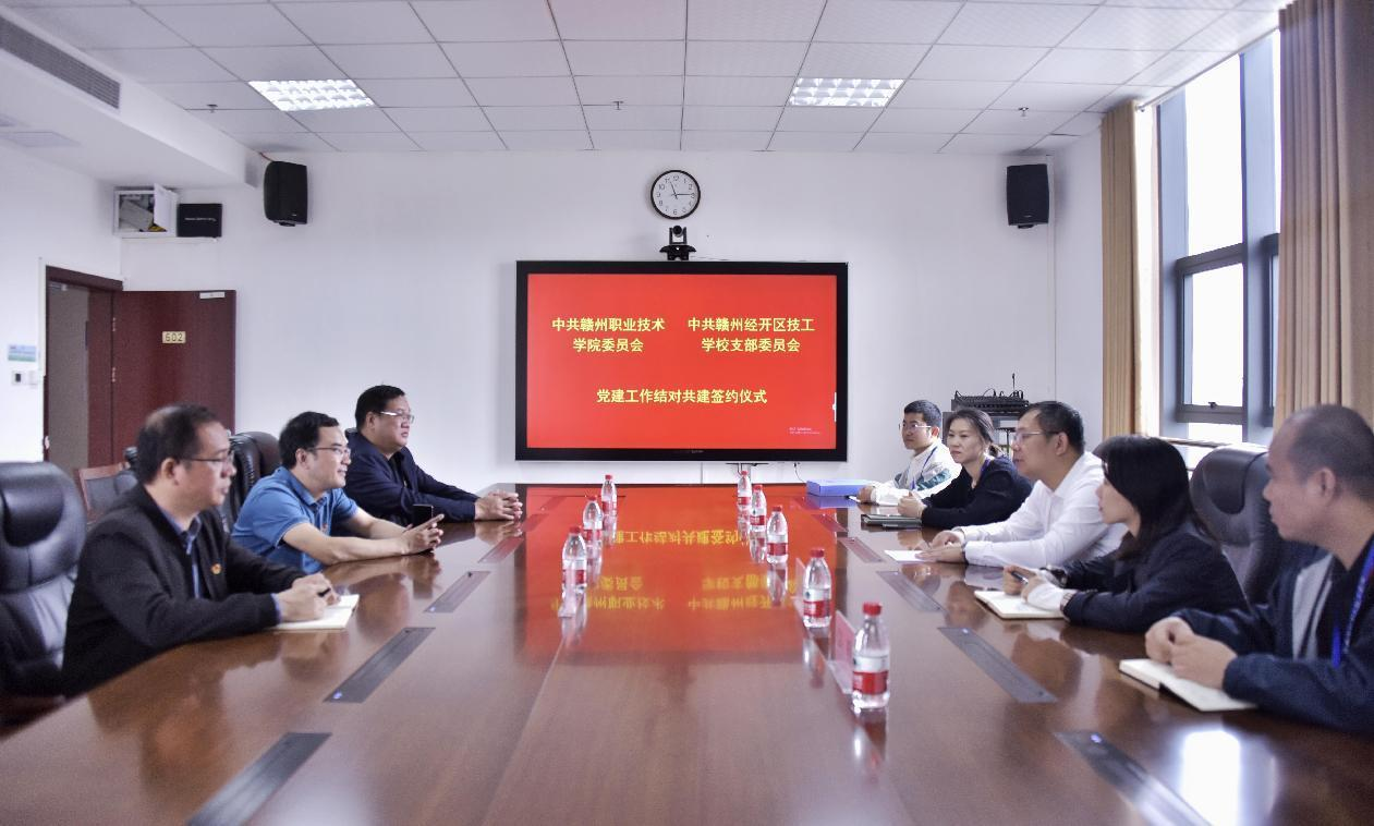 10月11日,贛州職業技術學院黨委與贛州經開區技工學校黨支部結對共建簽約儀式在學院行知樓六樓會議室舉行。學院黨委書記溫學延,黨委副書記湯曉軍,機關黨總支專職副書記林洪斌,贛州建控集團黨委書記肖日華,贛州經開區技工學校黨支部書記曾靚,黨支部副書記、校長杜瑤以及兩校相關部門同志出席簽約儀式。