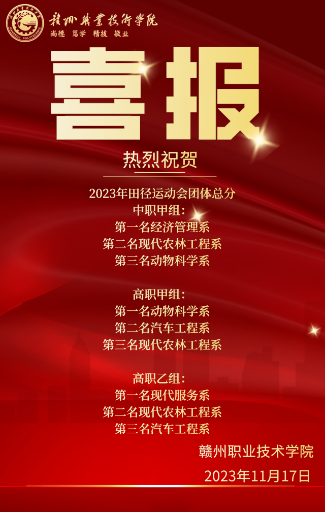 青春恰似火,逐夢正當(dāng)時(shí)。經(jīng)過為期三天的激烈比賽及全體運(yùn)動(dòng)員、裁判員和工作人員的共同努力,11月17日下午,贛州職業(yè)技術(shù)學(xué)院第五屆田徑運(yùn)動(dòng)會(huì)、贛州農(nóng)業(yè)學(xué)校第二十八屆田徑運(yùn)動(dòng)會(huì)、江西贛州技師學(xué)院第三十二屆田徑運(yùn)動(dòng)會(huì)在學(xué)院南運(yùn)動(dòng)場圓滿閉幕。