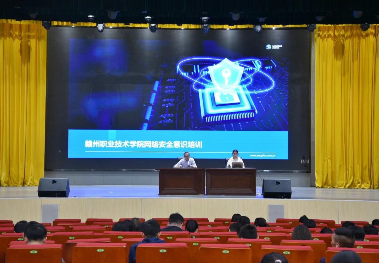 11月22日下午,學院網絡安全意識培訓暨第十五期“贛職大講堂”在行知樓多功能報告廳舉行。學院信息中心特邀深信服科技股份有限公司網絡安全專家進行現場授課,400余師生參加培訓。