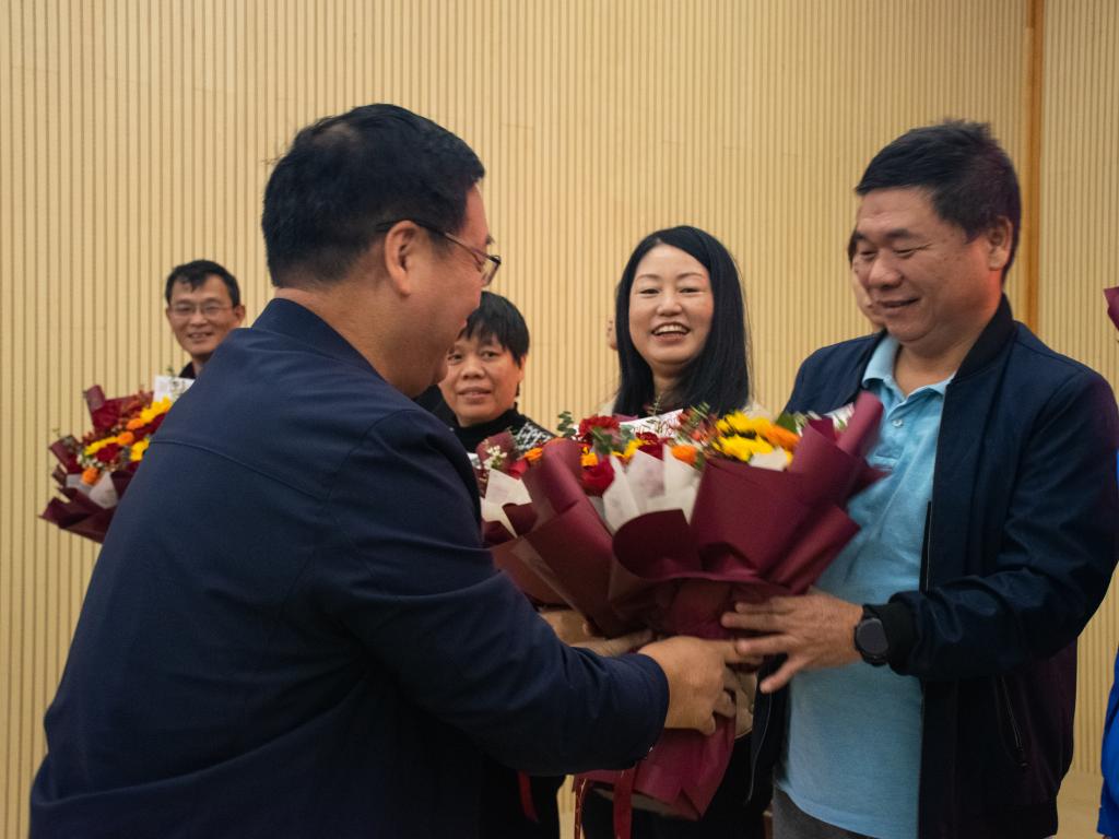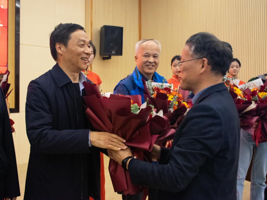 吳躍文、湯曉軍為退休教職工送上鮮花