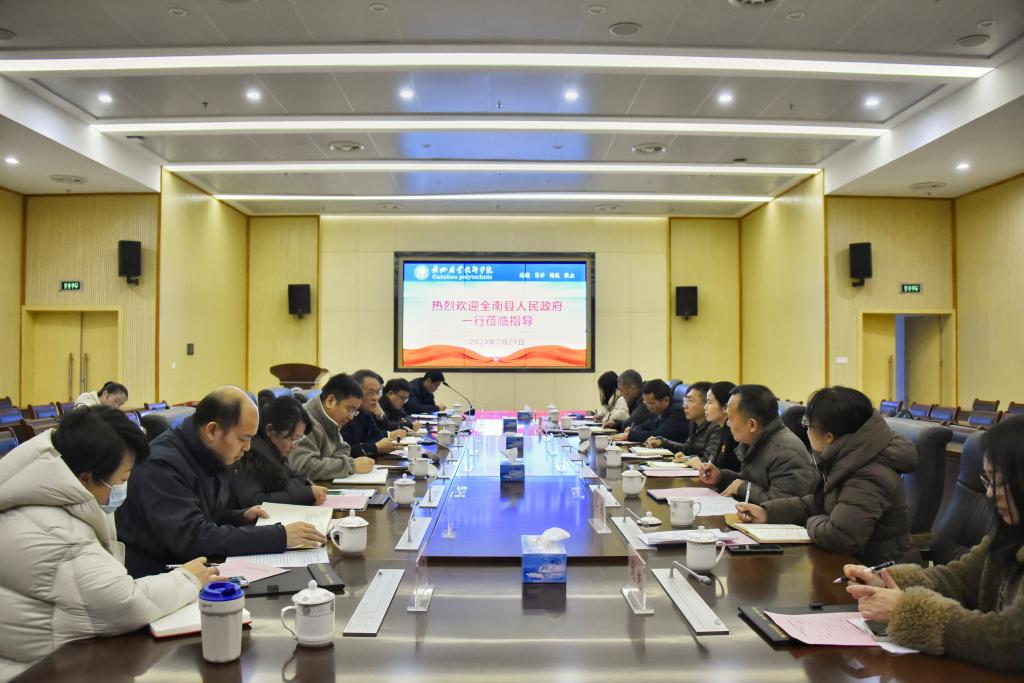 2月29日下午,全南縣人民政府縣委常委、副縣長楊堅一行蒞臨我校考察交流。學校黨委副書記、校長吳躍文參加會議并講話,全南縣人民檢察院檢察長陳萍參加會議,會議由學校副校長歐陽榮華主持。雙方就校地合作、校企合作等方面開展座談交流。