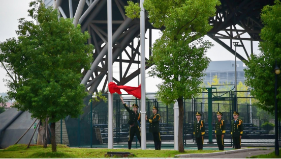 在莊嚴雄壯的國歌聲中,鮮艷的五星紅旗冉冉升起,全體師生面向國旗,肅立行禮,開學典禮拉開序幕。