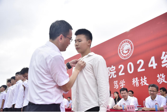 溫學延給新生代表佩戴校徽
