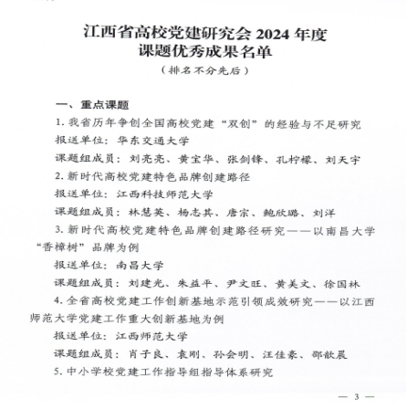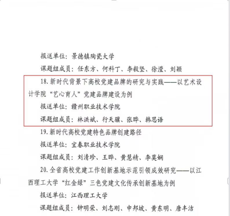近日,江西省黨的建設研究會下發《關于通報江西省黨建研究會2024年度課題優秀成果的通知》,我校藝術設計學院黨總支林洪斌團隊申報的黨建課題《新時代背景下高校黨建品牌的研究與實踐——以藝術設計學院“藝心育人”黨建品牌建設為例》入選江西省黨建研究優秀重點課題成果。