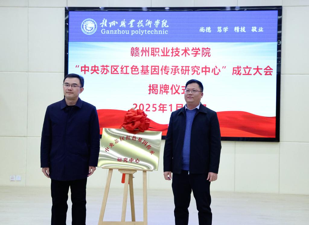 在熱烈的掌聲中,黨委書記溫學延與市社科聯副主席肖孟春共同為“中央蘇區紅色基因傳承研究中心”揭牌。這一時刻標志著贛州職業技術學院在紅色基因傳承研究方面邁出了重要的一步。