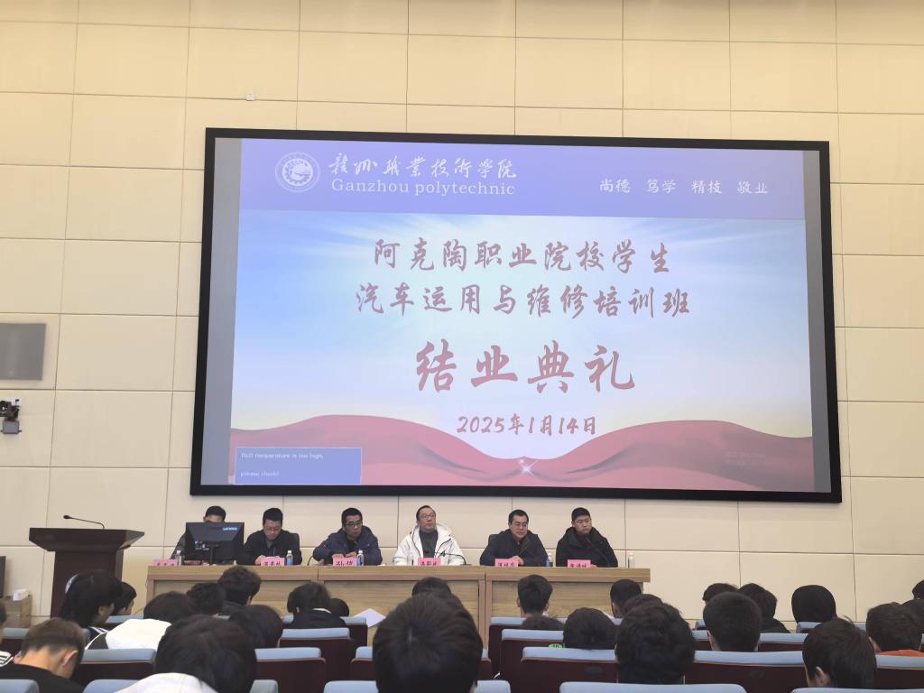 1月14日,新疆阿克陶職業院校汽車運用與維修培訓班結業典禮在學校圖書館報告廳隆重舉行,學校黨委委員、副校長湛邵斌出席會議并講話,會議由黨委委員、組織部部長溫繼榮主持,汽車工程學院院長孫愷、副書記張詩詠、副院長溫舉林、綜合辦主任李克力、班主任和任課教師代表以及阿克陶全體學員和帶隊老師參加了會議。