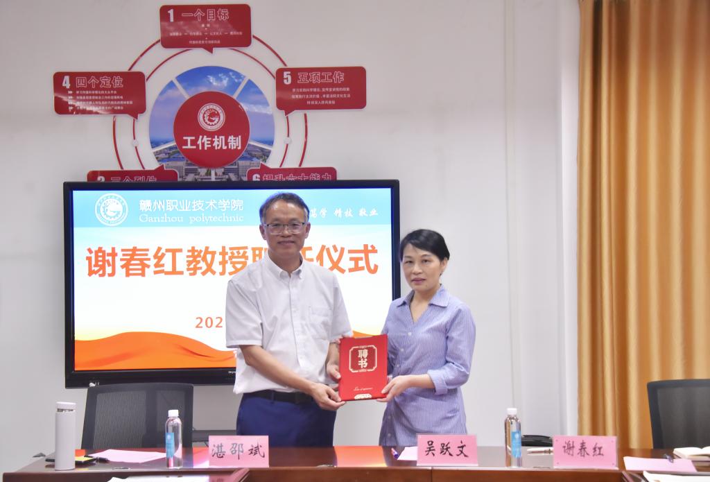 聘任儀式上,吳躍文為謝春紅頒發(fā)了“特聘教授”證書,并為其佩戴了?;?。