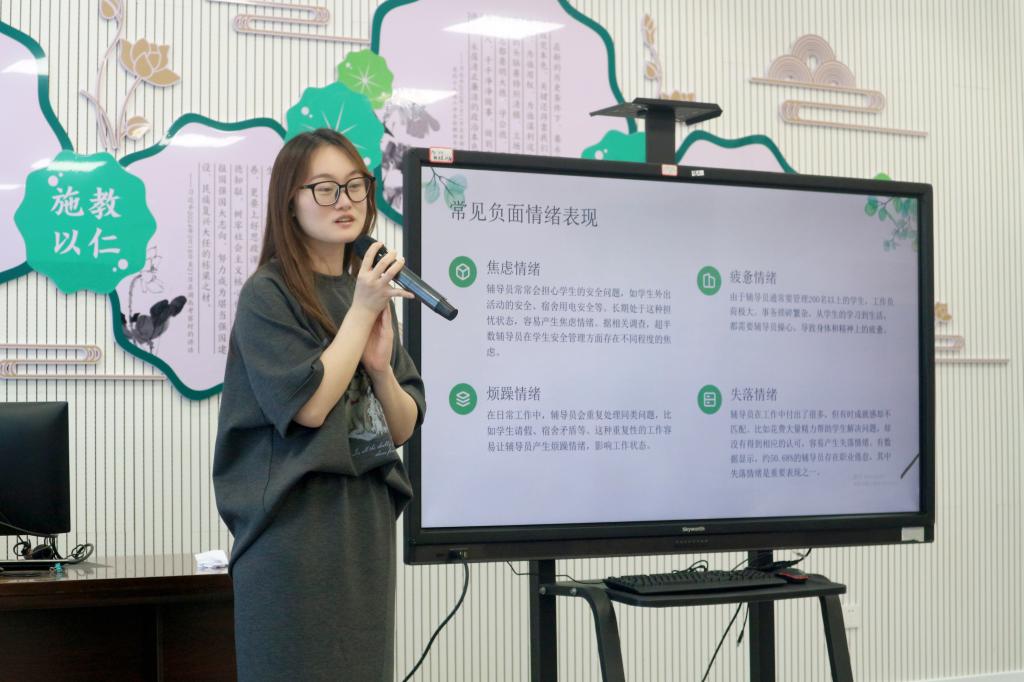 在經(jīng)驗(yàn)分享環(huán)節(jié),藝術(shù)設(shè)計(jì)學(xué)院輔導(dǎo)員羅蓉老師從“認(rèn)知重構(gòu)”“流程優(yōu)化”“能量管理”三個方面,為輔導(dǎo)員減壓提供了新的解決思路。現(xiàn)代服務(wù)學(xué)院輔導(dǎo)員余艷輝老師分享了如何降低煩惱指數(shù)的經(jīng)驗(yàn)。兩位老師鮮活的案例和幽默的表達(dá)贏得陣陣掌聲。