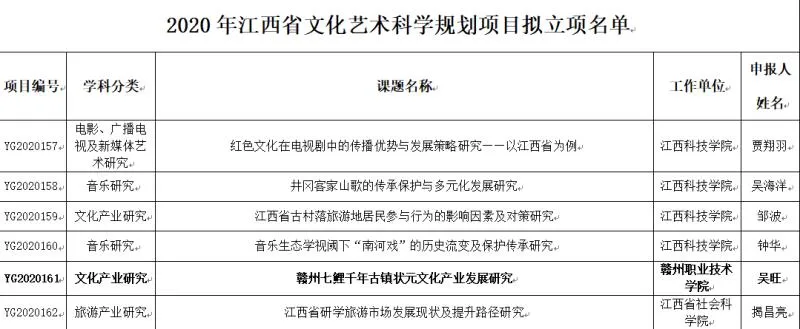 從江西省文化和旅游廳《關(guān)于印發(fā)2020年度江西省文化藝術(shù)科學(xué)規(guī)劃一般項(xiàng)目立項(xiàng)名單的通知》(贛文藝規(guī)〔2020〕4號(hào))獲悉,我院馬克思主義學(xué)院吳旺同志主持的《贛州七鯉千年古鎮(zhèn)狀元文化產(chǎn)業(yè)發(fā)展研究》(編號(hào):YG2020161;文化產(chǎn)業(yè)研究類(lèi))獲批立項(xiàng),這是我院首次獲該項(xiàng)目的立項(xiàng)。