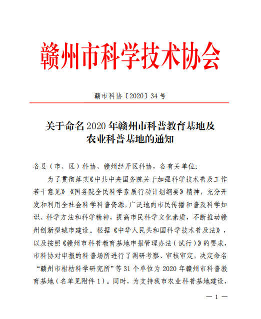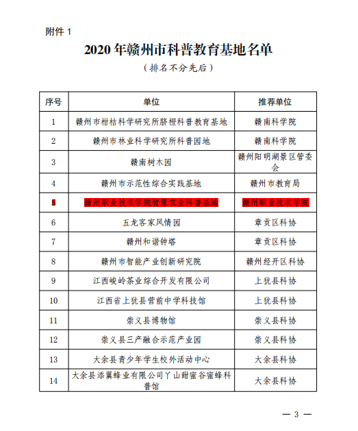 近日,我院“智慧農業科普基地”被贛州市科學技術協會授予“2020年贛州市科普教育基地”,這是我院2019年辦學以來第一個市級科普教育基地。