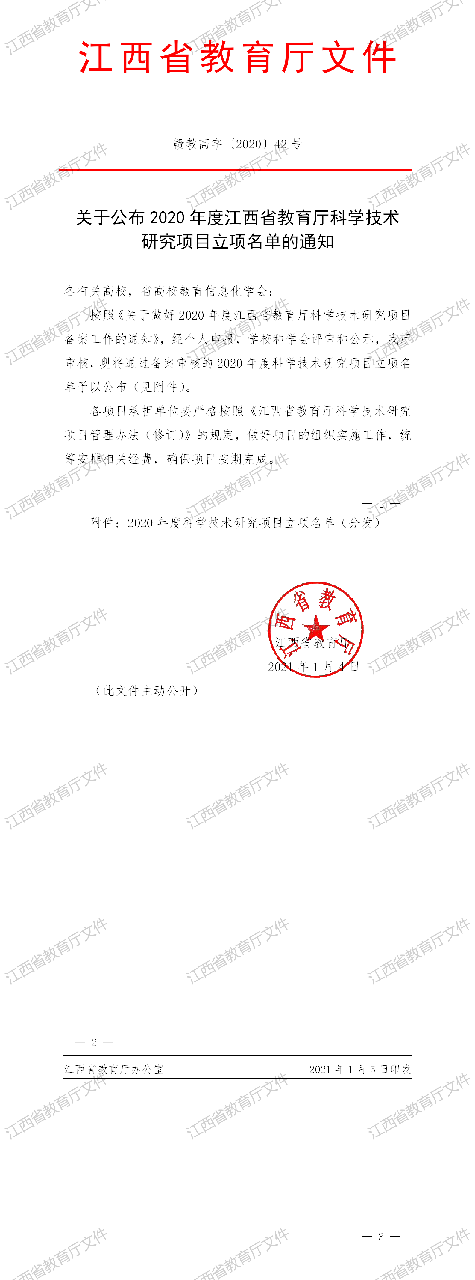 近日,從省教育廳《關(guān)于公布2020年度江西省教育廳科學(xué)技術(shù)研究項(xiàng)目立項(xiàng)名單的通知》(贛教高字〔2020〕42號(hào))文件獲悉,我院共有8項(xiàng)2020年度江西省教育廳科學(xué)技術(shù)研究項(xiàng)目獲準(zhǔn)立項(xiàng)。