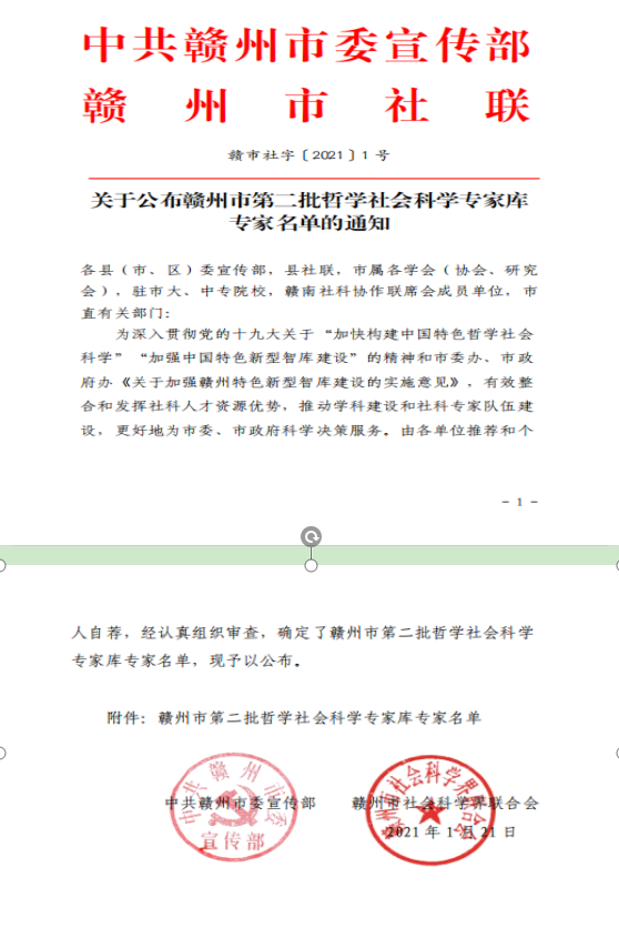近日,中共贛州市委宣傳部、贛州市社會科學界聯合會公布了贛州市第二批哲學社會科學專家庫專家名單,我院王甫良、宋華、曾衛平、吳旺、鐘閩、舒寬宏、陳妍利等7位教師入選。