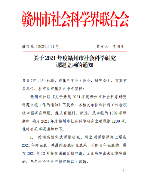 近日,從贛州市社會科學(xué)界聯(lián)合會發(fā)布的《關(guān)于2021年度贛州市社會科學(xué)研究課題立項(xiàng)的通知》(贛市社〔2021〕11號)獲悉,我院11項(xiàng)課題喜獲立項(xiàng)。