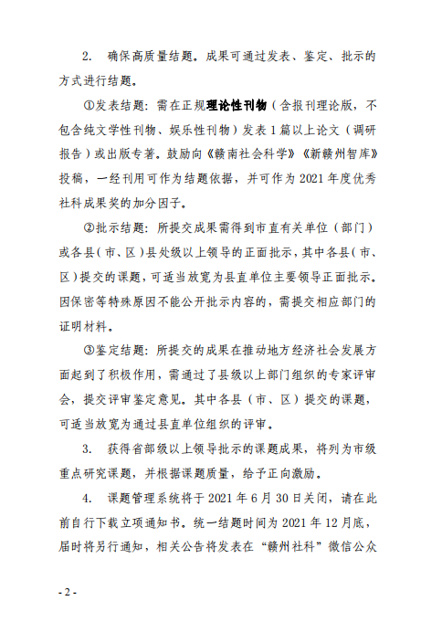 科研處將嚴(yán)格按照《關(guān)于2021年度贛州市社會科學(xué)研究課題立項(xiàng)的通知》要求,引導(dǎo)各教學(xué)系、課題組積極做好課題研究工作,高質(zhì)量完成研究任務(wù),取得預(yù)期研究成果。(撰稿:黃珍英;初審:陳曦 ;編輯:楊盛欽;復(fù)審:曾衛(wèi)平)
