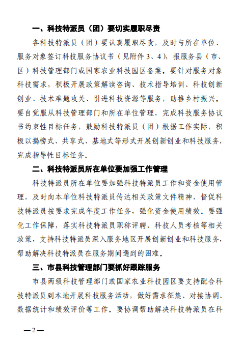 科技特派員要針對服務對象科技需求,積極開展政策解讀咨詢、技術指導培訓、科技創新創業、技術難題攻關、引進科技資源等服務,助推鄉村振興;根據工作實際,積極以揭榜式、共享式、基地式等形式開展創新創業和科技服務,完成指導性目標任務。