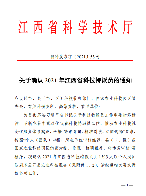 近日,從江西省科學技術廳文件《關于確認2021年江西省科技特派員的通知》(贛科發農字〔2021〕53號)獲悉,我院高暉、吳輝生、謝長智、李淑云等4名教師被確定為2021年江西省科技特派員。
