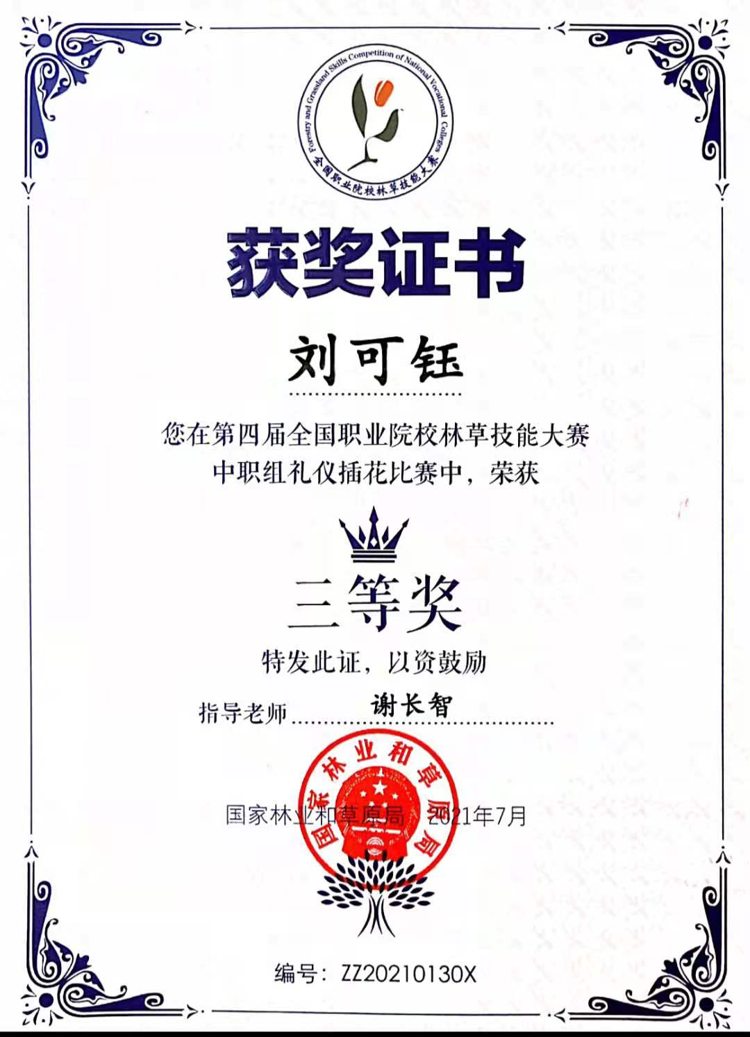 7月10-12日,第四屆全國職業院校林草技能大賽在江蘇農林職業技術學院舉辦。全國職業院校林草技能大賽是國家林業和草原局面向林草職業教育相關專業在校學生的一項品牌賽事,大賽每兩年舉辦一次。本屆大賽設有園林景觀設計(高職)、禮儀插花(中職)等5個賽項。來自全國54所職業院校的選手參加了比賽。我院19園藝(五年制)學子劉可鈺經過努力拼搏,最終以第9名的成績獲得三等獎。