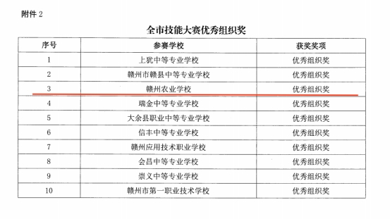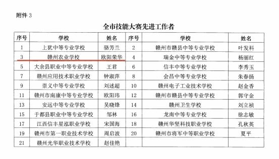 同時,贛州農(nóng)業(yè)學(xué)校榮獲“全市技能大賽優(yōu)秀組織獎”,歐陽榮華榮獲“全市技能大賽先進(jìn)工作者”稱號。