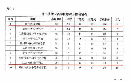 近日,由贛州市教育局印發(fā)的《關(guān)于2022年贛州市中等職業(yè)學(xué)校技能大賽獲獎名單的通報》(贛市教職成字〔2022〕21號)獲悉,贛州農(nóng)業(yè)學(xué)校、江西贛州技師學(xué)院在全市技能大賽學(xué)校總積分排名情況中分別排行第1名、第9名。其中,贛州農(nóng)業(yè)學(xué)校參賽師生獲一等獎20個,二等獎18個,三等獎20個;江西贛州技師學(xué)院獲二等獎12個,三等獎16個。