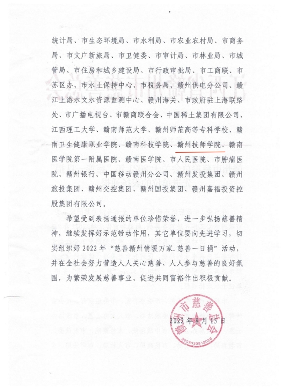 在8月24日召開的贛州市2021年度“慈善一日捐”表彰大會上,我院(江西贛州技師學院)被表彰為贛州市2021年度“慈善一日捐”先進單位。