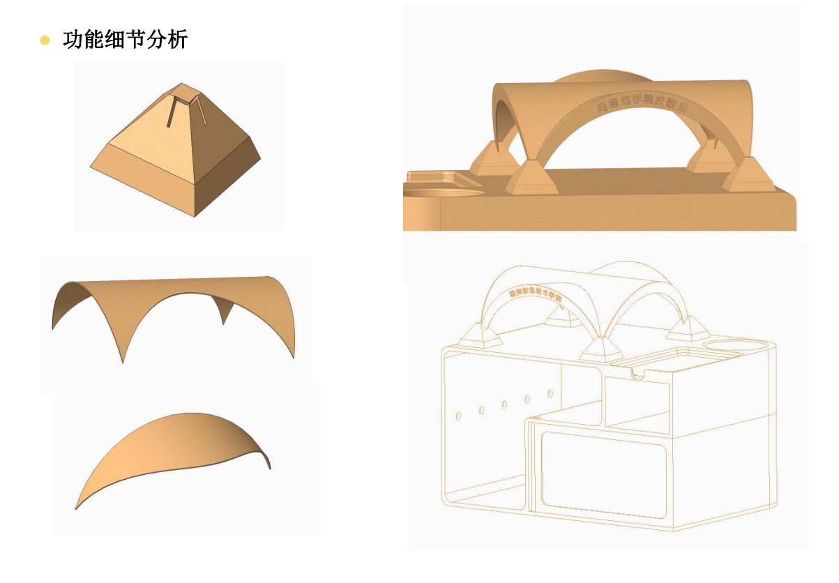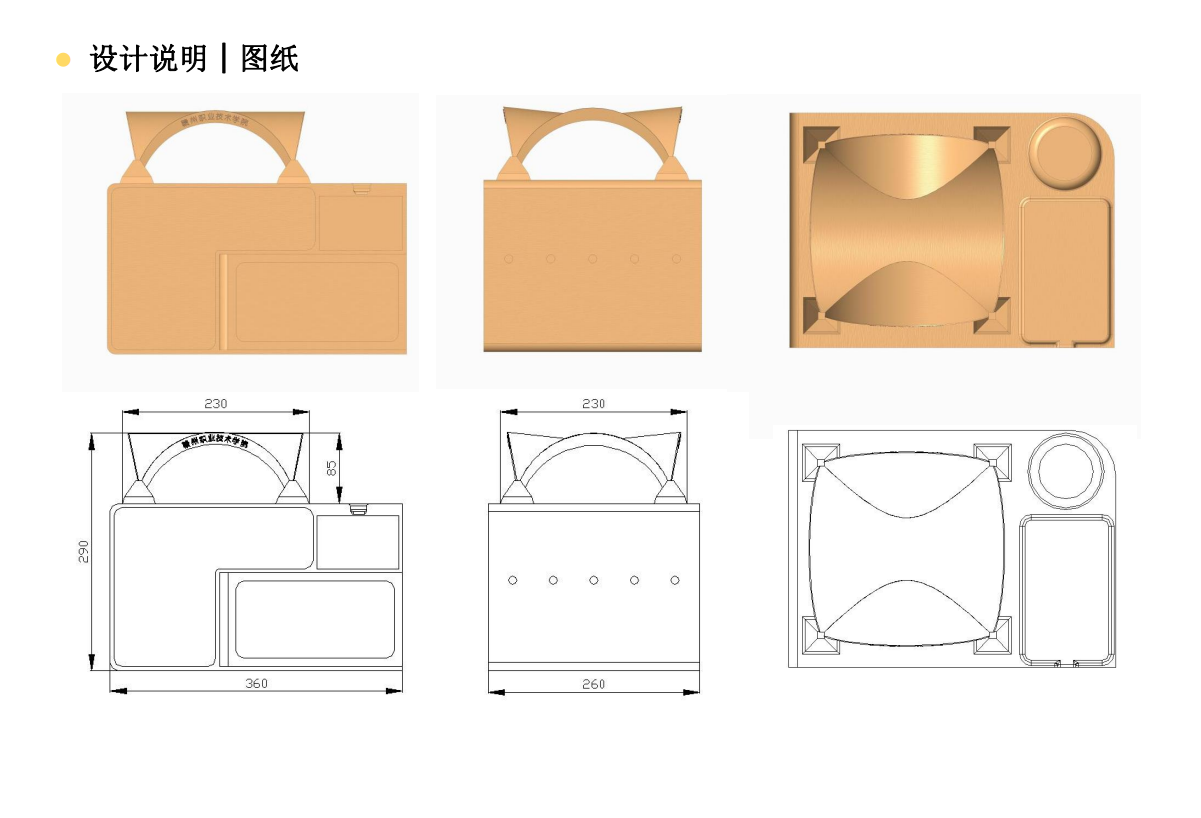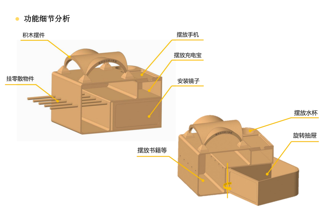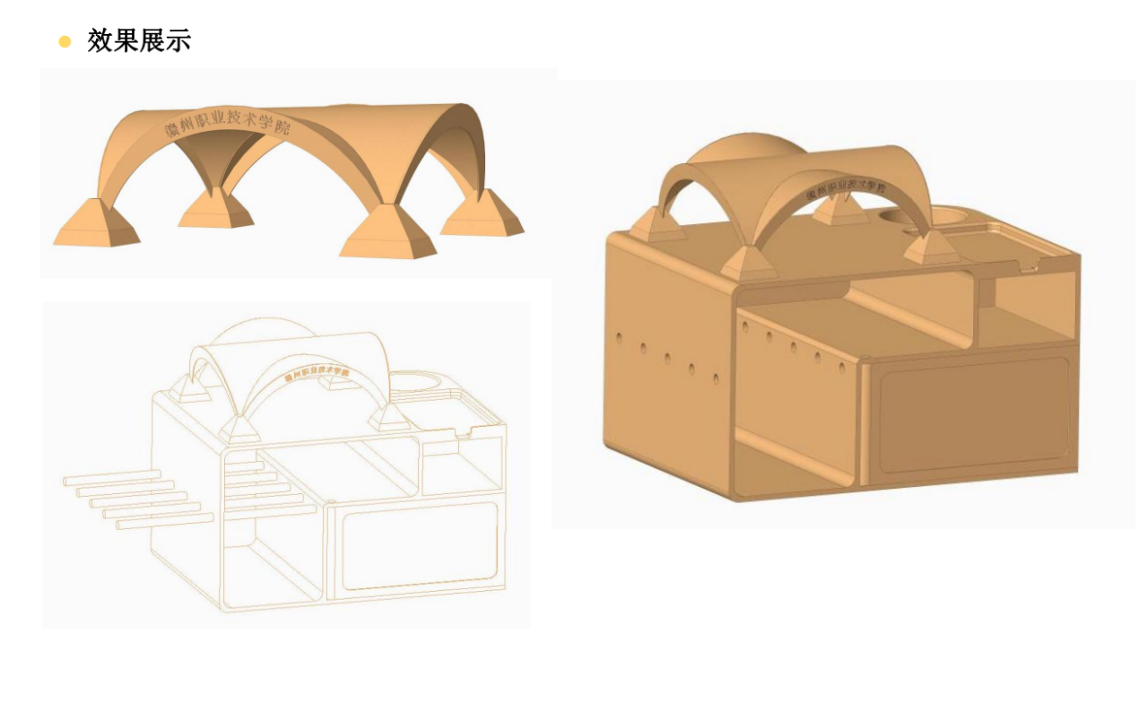 贛職風(fēng)雨多功能收納箱設(shè)計(jì)靈感來源于贛州職業(yè)技術(shù)學(xué)院風(fēng)雨球場。設(shè)計(jì)了風(fēng)雨球場積木擺件,通過對積木零件的DIY組裝,可以拼成風(fēng)雨球場造型。設(shè)計(jì)中融入了校園建筑、校名和校訓(xùn)等文化元素。此收納箱不僅造型獨(dú)特,同時(shí)兼具杯架、手機(jī)和充電寶托架、書架、掛鉤、收納盒、化妝鏡等多種實(shí)用功能。