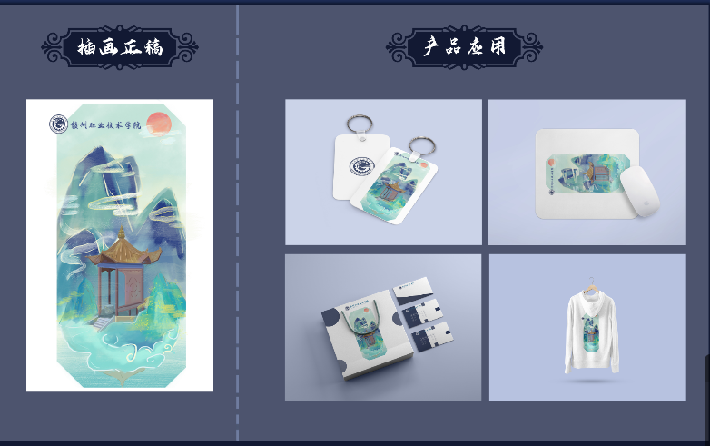 設(shè)計(jì)圍繞“贛州職業(yè)技術(shù)學(xué)院”主題進(jìn)行相關(guān)元素的創(chuàng)作,展示學(xué)校的具有代表性的建筑,色彩搭配以藍(lán)色為主色調(diào),其他顏色為副色調(diào),增強(qiáng)整體視覺效果。