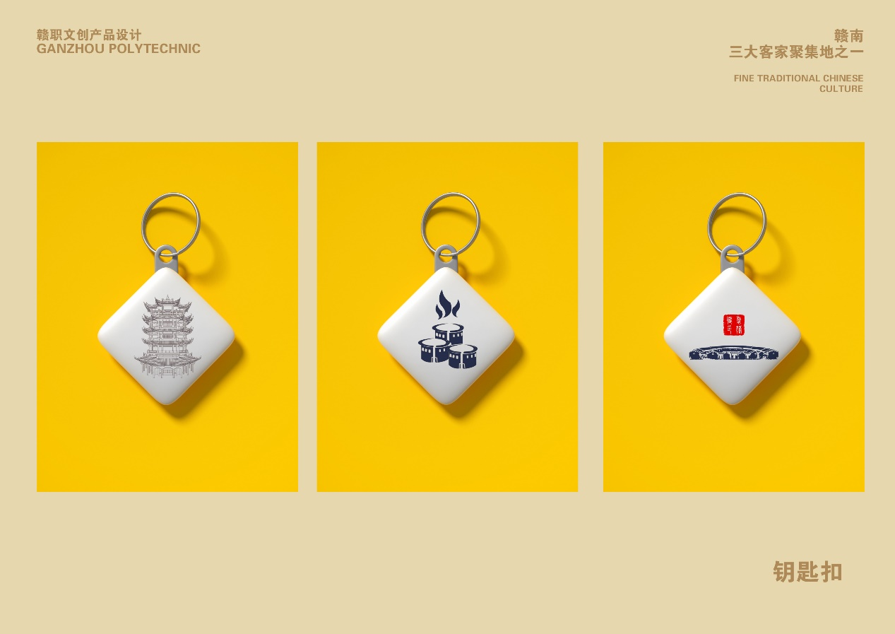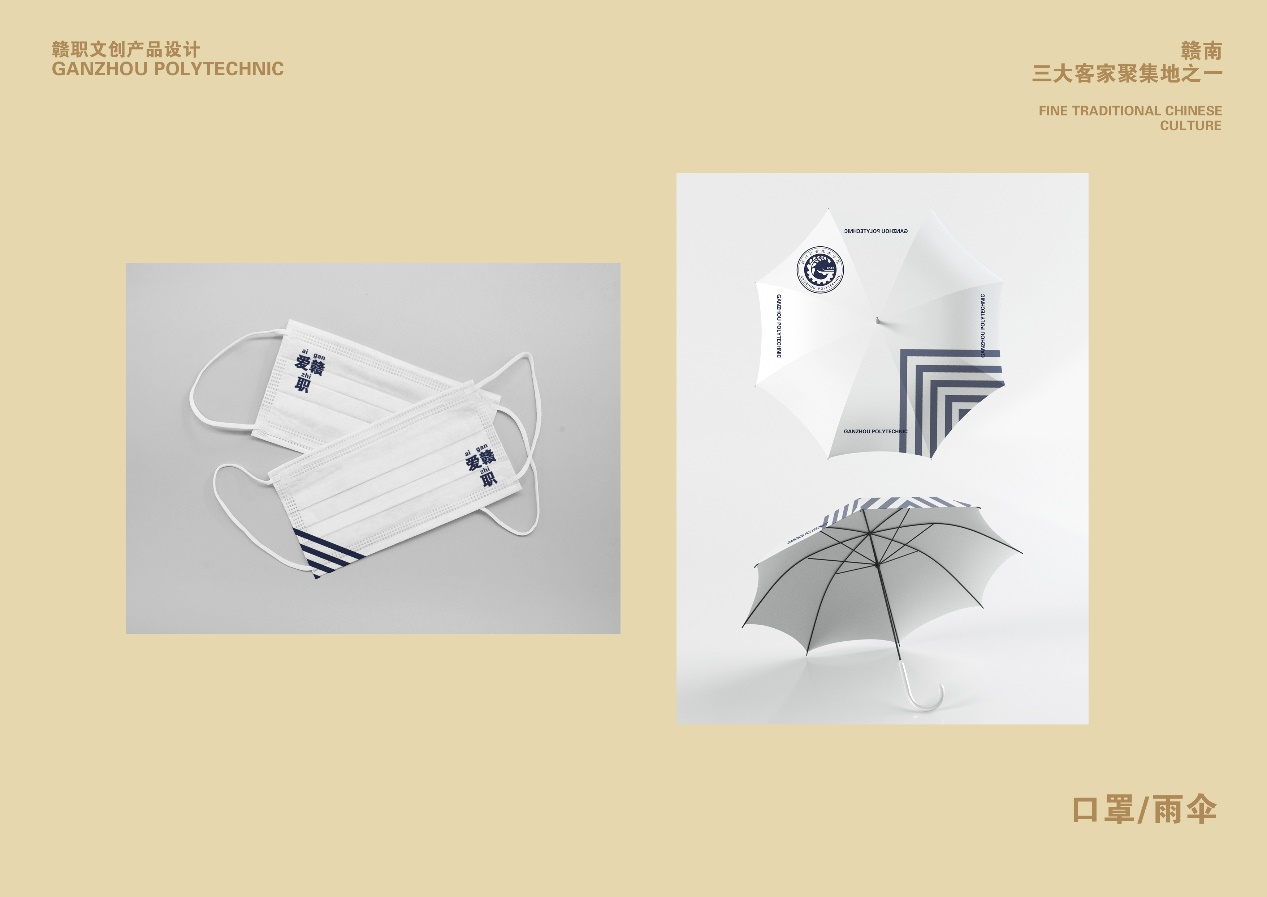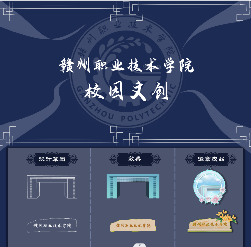 文創(chuàng)創(chuàng)意靈感來源于學(xué)校特色建筑,將學(xué)校建筑特色與贛南特色相結(jié)合進(jìn)行創(chuàng)作,并融入了當(dāng)?shù)靥厣M南臍橙。營造一種漫步橙園中、美景盡收眼底的氛圍,融合自然人文元素讓人感受到贛南的古色古香的美麗景色。色彩上整體采用深藍(lán)、白、綠、藍(lán)分別與白墻、云霧、泉水實(shí)際景觀相呼應(yīng)。“大門”用徽章的形式體現(xiàn)出贛職風(fēng)采,運(yùn)用了大膽創(chuàng)新、概括生動(dòng)表現(xiàn)手法。